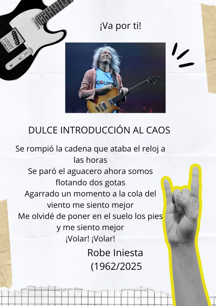 Para homenajear al gran poeta y músico Robe Iniesta que falleció el pasado 10 de diciembre hemos decidido elaborar un especial de POESÍA PARA LLEVAR. Con este especial no solo queremos rendir homenaje a tan insigne poeta y músico sino que también queremos dar a conocer al alumnado del IES RAMÓN Y CAJAL algunos de sus versos.