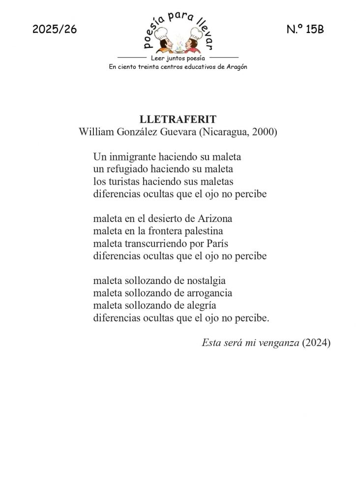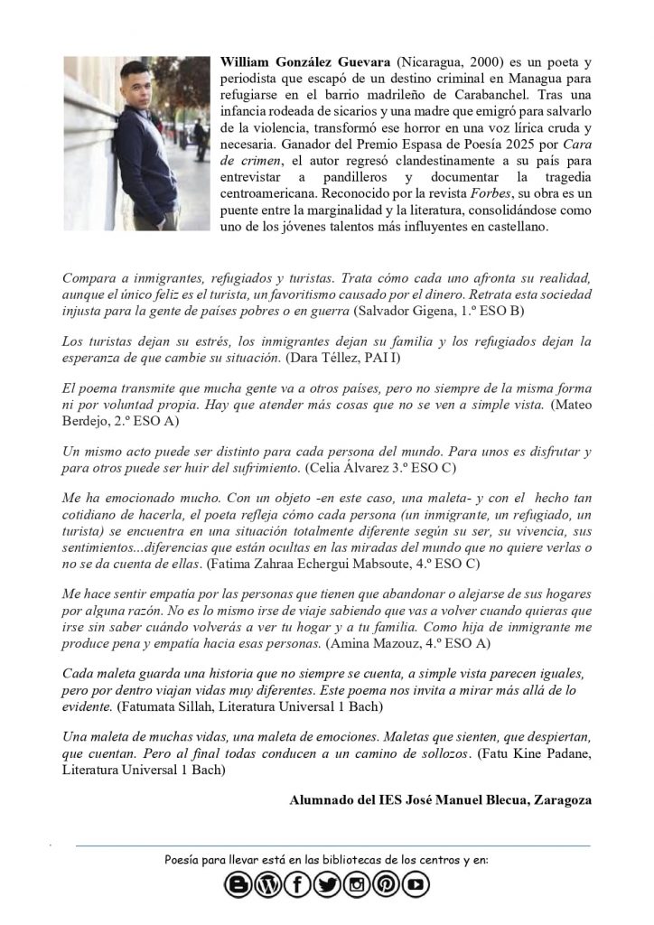 Desde el IES Blecua nos llega este poema del poeta William González Guevara, un poema lleno de emociones que nos hace coger nuestra «maleta» y llenarla de sueños, un poema que hace reflexionar sobre la vida y el momento social que estamos viviendo.