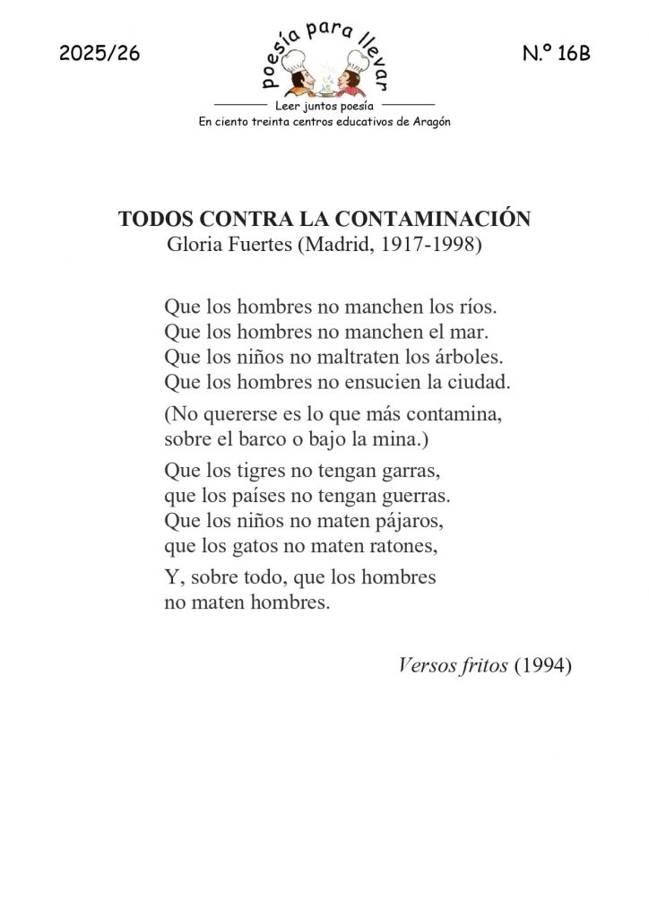 Desde el IES Baix Matarranya nos envían el poema de Gloria Fuertes «Todos contra la contaminación» de Gloria Fuertes. Nos dicen que lo han elegido porque aborda de forma clara y sencilla dos de los problemas más importantes de la actualidad: la contaminación y las guerras. Este poema nos invita a reflexionar sobre el impacto negativo que las personas tenemos tanto en el medio ambiente como en la convivencia entre nosotros. Gloria Fuertes señala que el origen de estos problemas está en la falta de respeto, de empatía y de valores, lo que lo convierte en un mensaje muy profundo a pesar de su brevedad.