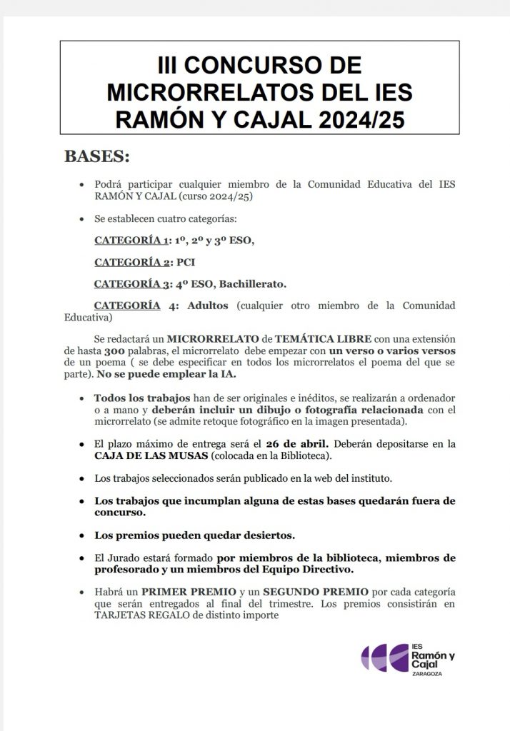 Invitamos a participar a toda la Comunidad Educativa del IES Ramón y Cajal al concurso de Microrrelatos del IES RAMÓN Y CAJAL
